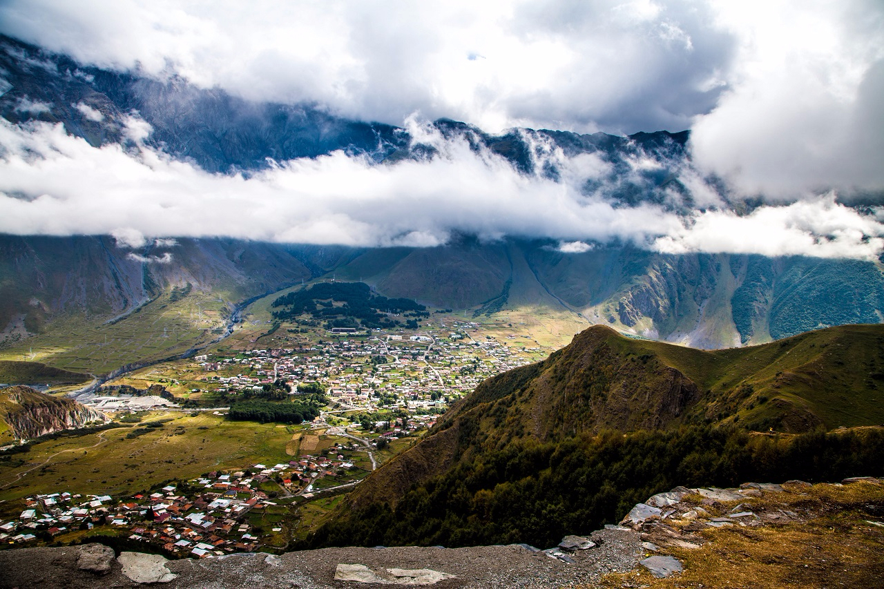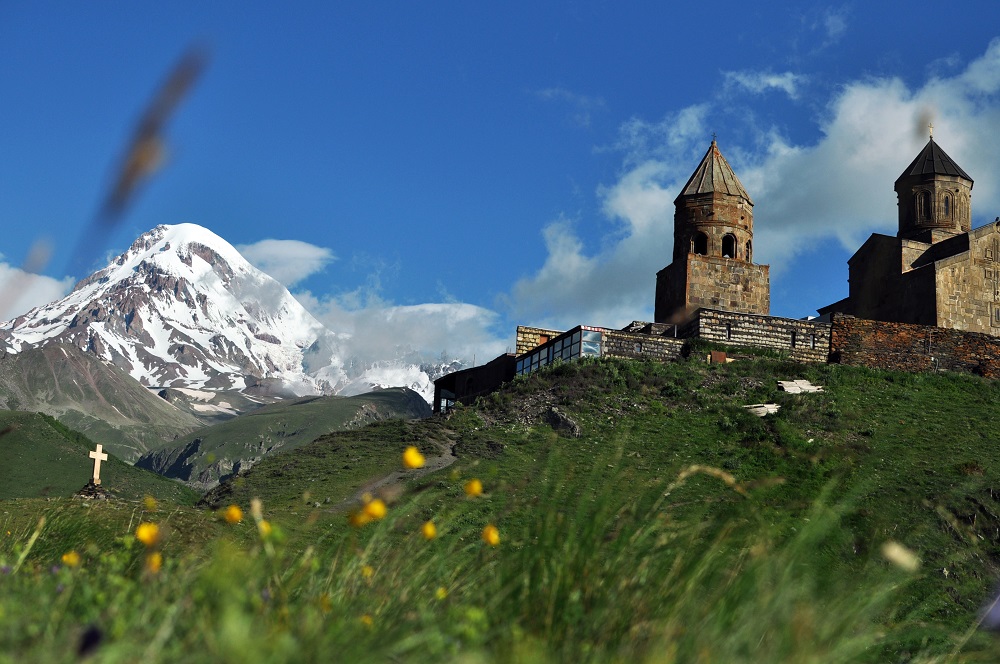 Гергетская Самеба — удивительный храм. Это редкий случай храма высоко в горах, на высоте 2170 метров от уровня моря. Необычное сочетание архитектуры и снега. Его можно красиво фотографировать на фоне ледников Казбека.